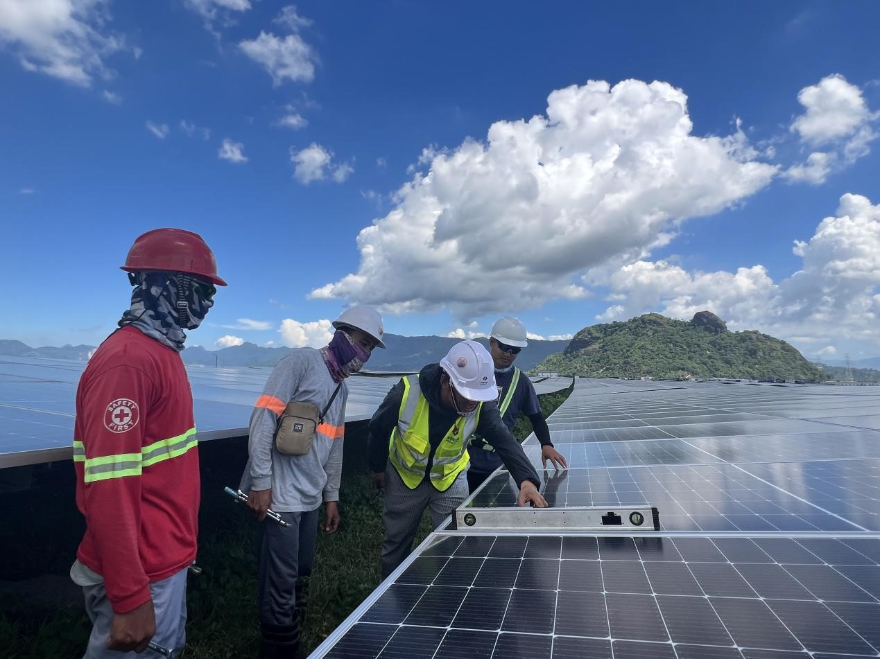 A Chinese engineer (middle) takes Philippine staff members to adjust solar panel racks in a solar farm built by Chinese enterprises in San Marcelino, the Philippines. Upon completion, the solar farm will become the largest of its kind in the Philippines. (Photo/Yang Huoran)