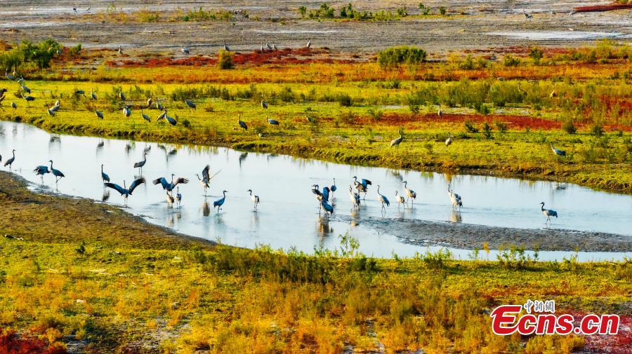 A flock of gray cranes forage at Ebinur Lake wetland natural reserve in Bortala Mongol Autonomous Prefecture, northwest China’s Xinjiang Uyghur Autonomous Region. (Photo: China News Service/Qin Guilian)