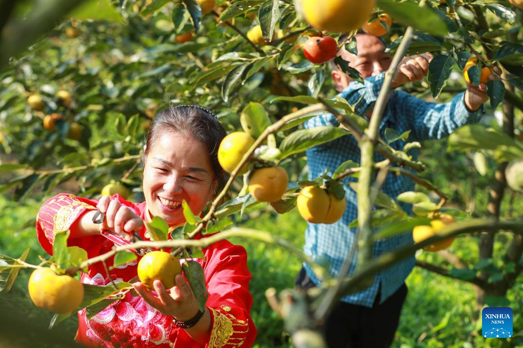 Farmers harvest persimmons at Jiuwantang Village of Yichang City, central China's Hubei Province, Oct. 11, 2023. (Photo by Wang Gang/Xinhua)
