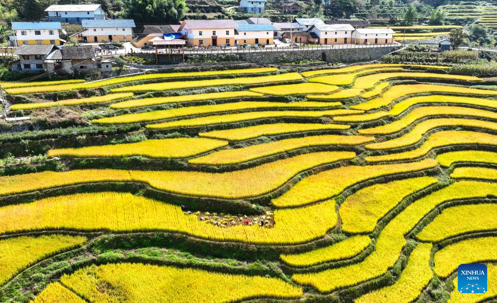 This aerial photo taken on Oct. 11, 2023 shows villagers harvesting rice at a terraced field in Changchun Village of Yichang City, central China's Hubei Province. (Photo by Zheng Jiayu/Xinhua)
