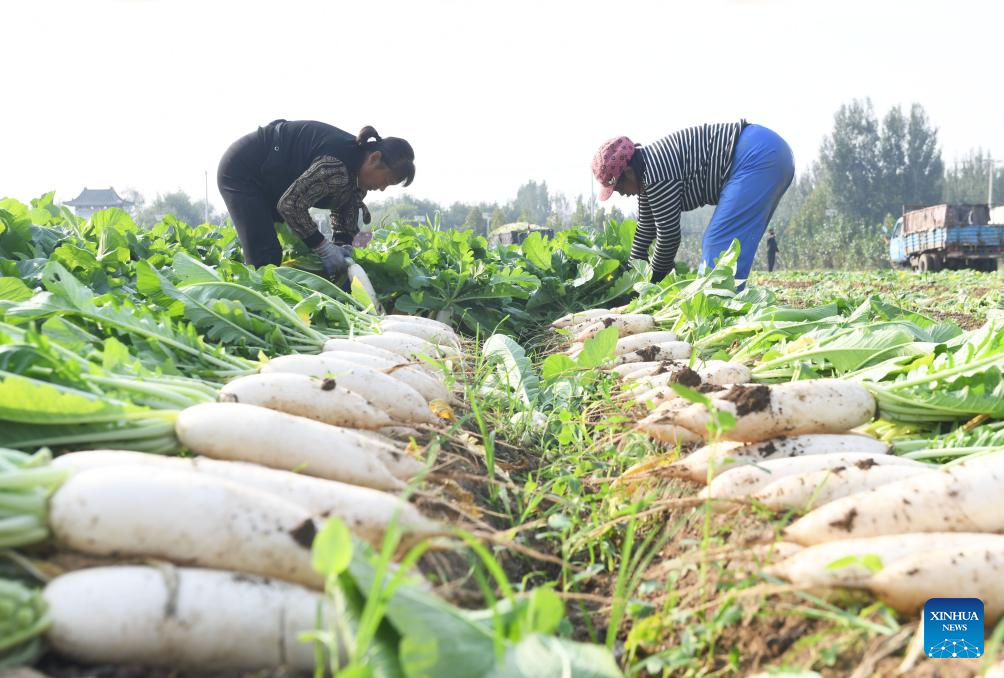 Villagers harvest white radishes at Jiangu Village of Shijiazhuang, north China's Hebei Province, Oct. 11, 2023. (Photo by Jia Minjie/Xinhua)