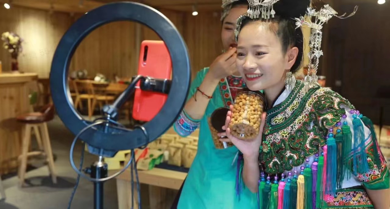 Members of Zhang Guodan's team promote local products via livestreaming. (Photo/Guizhou Culture and Tourism Department)