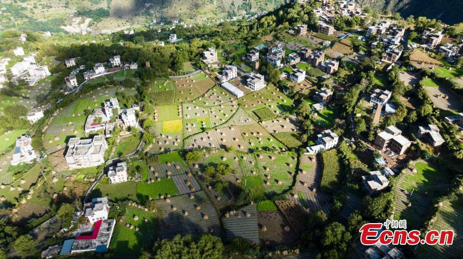 A beautiful scene of traditional Tibetan houses on green mountain under the blue sky in Zhonglu Village of Danba County, Ganzi Tibetan Autonomous Prefecture, southwest China’s Sichuan Province, Oct. 10, 2023. (Photo: China News Service/Sun Zhongnan)