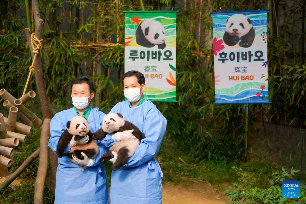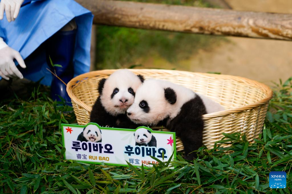 Giant panda twins meet public and revealed names in Yongin, S. Korea