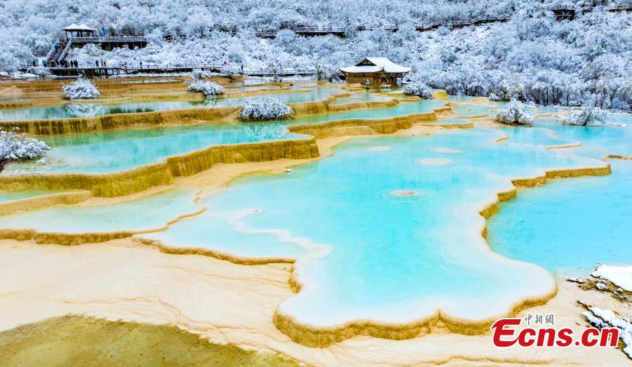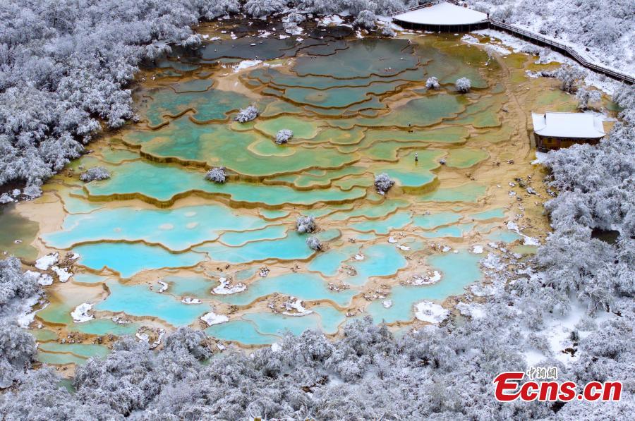 Beautiful ponds and surrounding mountains are blanketed with snow, resembling a charming wonderland at Huanglong Scenic and Historic Interest Area in Songpan County, southwest China's Sichuan Province, Oct. 12, 2023. Famous for its colorful water pools, snow mountains, deep valleys and forests, Huanglong was listed as one of UNESCO world heritage sites in 1992. (Photo: China News Service/Jiang Yuebin)