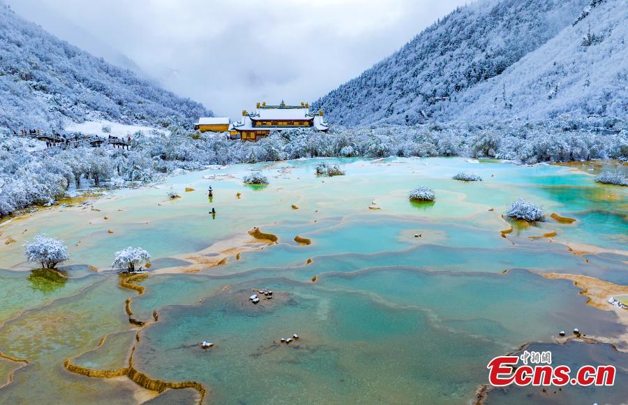 Beautiful ponds and surrounding mountains are blanketed with snow, resembling a charming wonderland at Huanglong Scenic and Historic Interest Area in Songpan County, southwest China's Sichuan Province, Oct. 12, 2023. Famous for its colorful water pools, snow mountains, deep valleys and forests, Huanglong was listed as one of UNESCO world heritage sites in in1992. (Photo: China News Service/Jiang Yuebin)