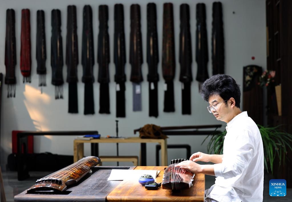 Guqin maker Xu Bing plays the Guqin at Lankao county of Kaifeng city, Central China's Henan province, on Oct 9, 2023. Lankao county is rich in paulownia trees, an ideal raw material for musical instrument manufacturing. [Photo/Xinhua]