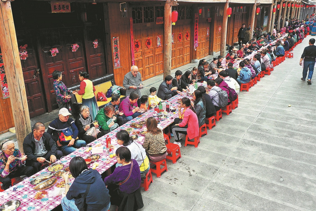 Photo taken on Oct 10, 2023, shows tourists taking part in a "hundred-family banquet" in Longsheng, a county in Guilin, Guangxi Zhuang autonomous region. Apart from the banquet, local residents belonging to the Zhuang ethnic group celebrated the harvest by demonstrating primitive fishing skills, releasing thousands of fry, fishing in muddied waters and competing in the art of filleting fish. [Photo/chinadaily.com.cn]
