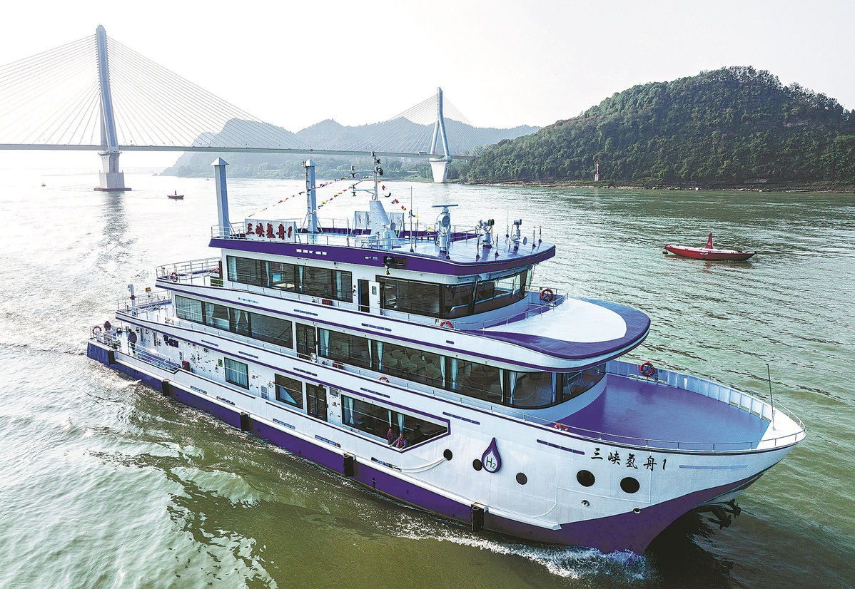 China's first hydrogen-powered vessel Three Gorges Hydrogen Boat No 1 sails on its maiden voyage on the Yangtze River in Yichang, Hubei province, on Oct 11, 2023. The sailing marks a breakthrough in the application of hydrogen fuel cell technology on inland waterway vessels. [Photo/Xinhua]
