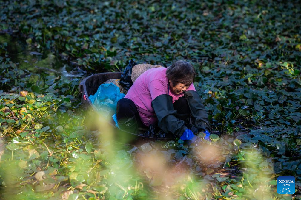 A villager picks water caltrops in Donglin Town of Huzhou City, east China's Zhejiang Province, Oct. 12, 2023. (Xinhua/Xu Yu)