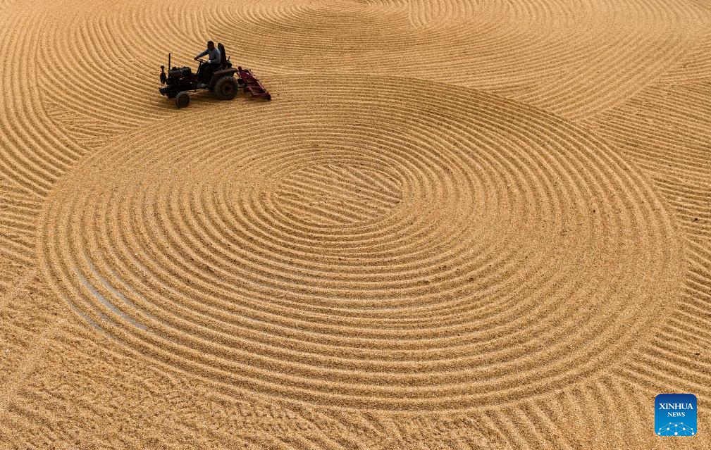 This aerial photo taken on Oct. 12, 2023 shows a farmer drying grains in Xianju County of Taizhou City, east China's Zhejiang Province. (Photo by Wang Huabin/Xinhua)