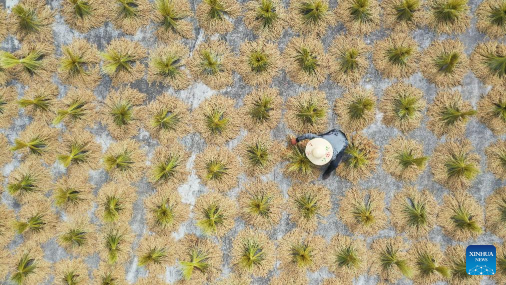 This aerial photo taken on Oct. 12, 2023 shows a farmer drying glutinous rice in Congjiang County of Qiandongnan Miao and Dong Autonomous Prefecture, southwest China's Guizhou Province. (Photo by Luo Jinglai/Xinhua)