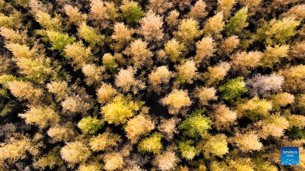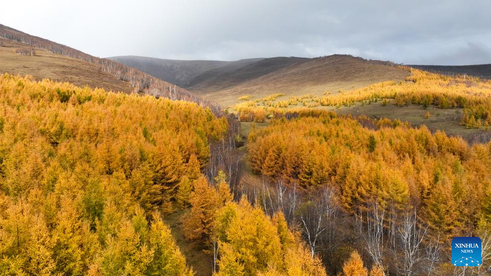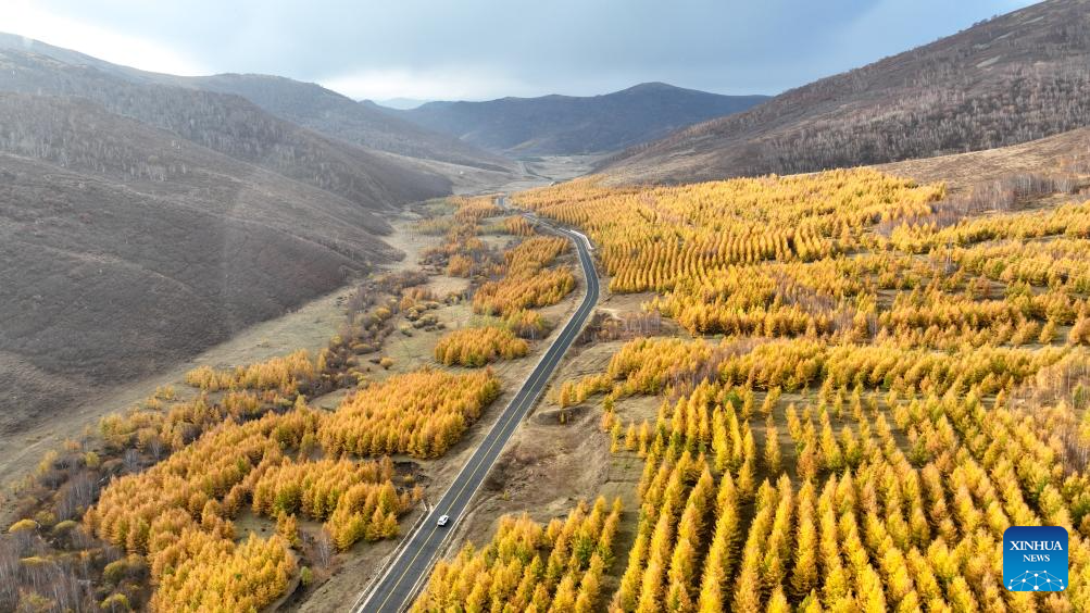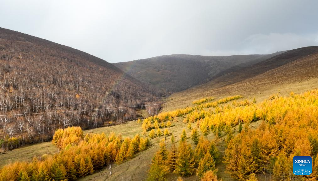 This aerial photo taken on Oct. 13, 2023 shows the autumn scenery in Hexigten Banner of Chifeng City, north China's Inner Mongolia Autonomous Region. (Xinhua/Bei He)