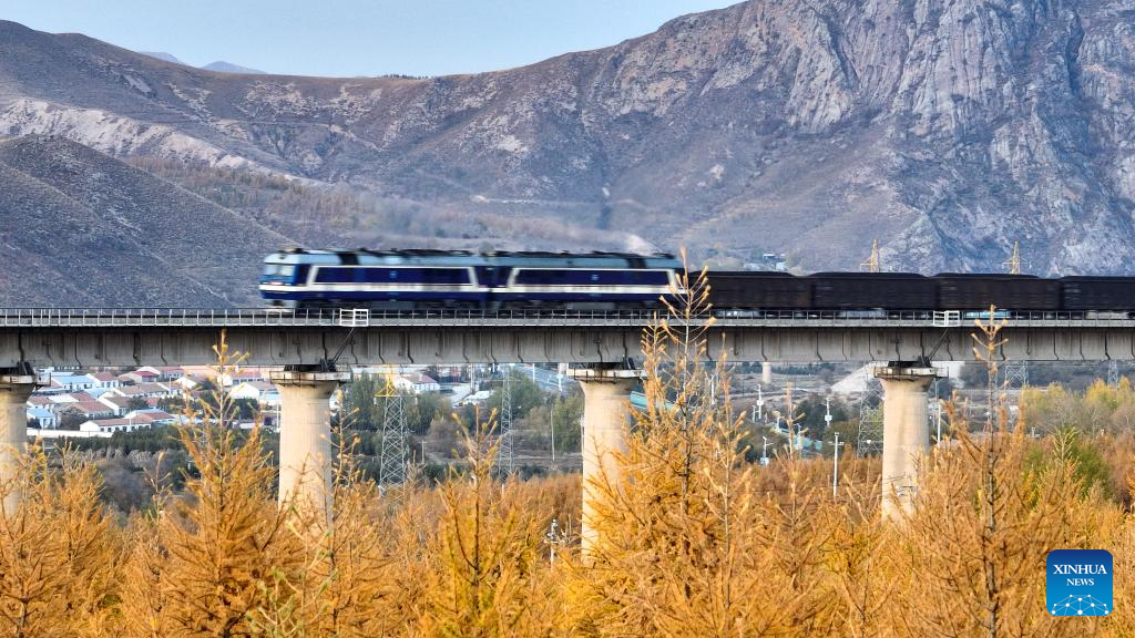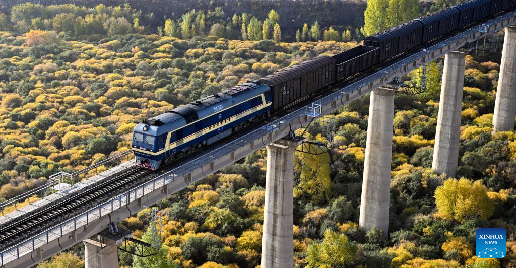 A train passes on a bridge in Hexigten Banner of Chifeng City, north China's Inner Mongolia Autonomous Region, Oct. 12, 2023. (Xinhua/Bei He)