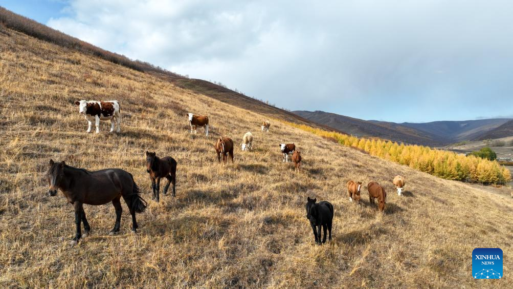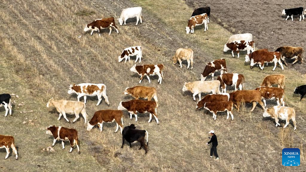 This aerial photo taken on Oct. 13, 2023 shows a herdsman keeping watch over cattle in Hexigten Banner of Chifeng City, north China's Inner Mongolia Autonomous Region. (Xinhua/Bei He)