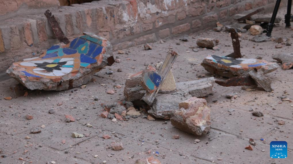 This photo taken on Oct. 12, 2023 shows debris scattered at the Great Mosque of Herat after a series of earthquakes in Herat Province, Afghanistan. Several historical monuments and cultural heritages have been damaged due to a series of devastating earthquakes and aftershocks that jolted west Afghanistan's Herat and the neighboring Badghis and Farah provinces, Herat's Provincial Director for Information and Culture Ahmadullah Muttaqi said on Thursday. (Photo by Mashal/Xinhua)