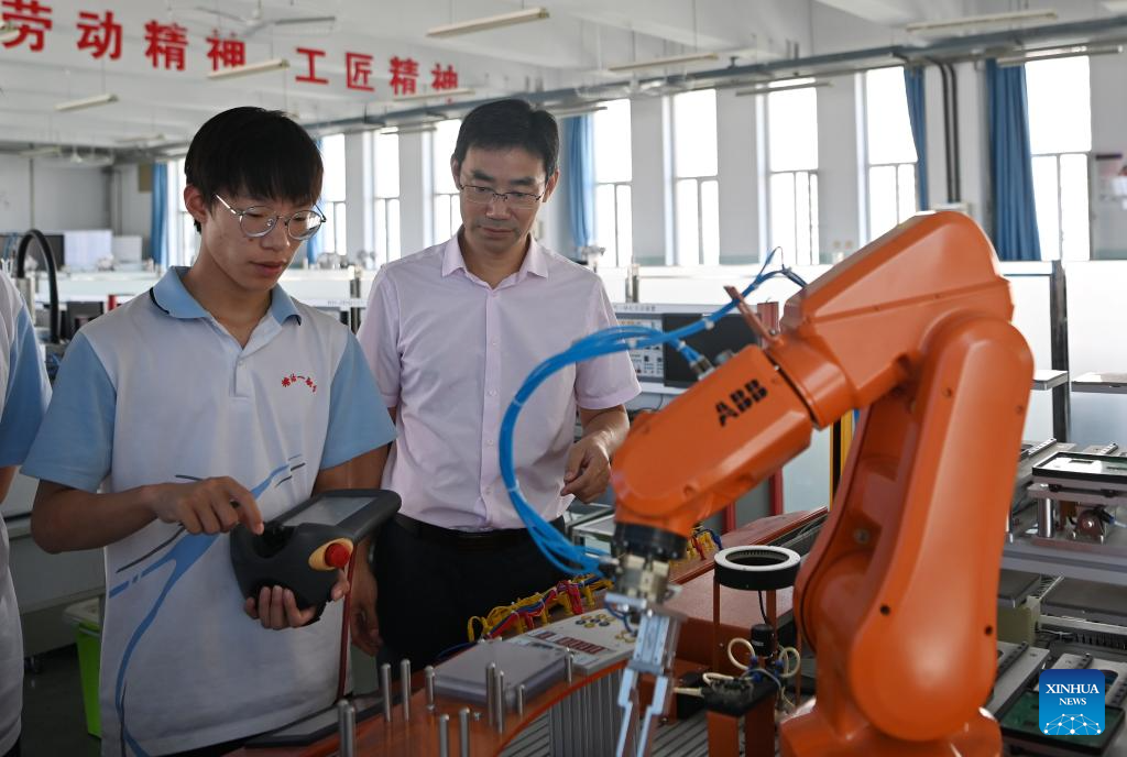 A teacher (R) instructs a student to operate machines at the First Vocational School of Tanggu in north China's Tianjin, Sept. 14, 2023.