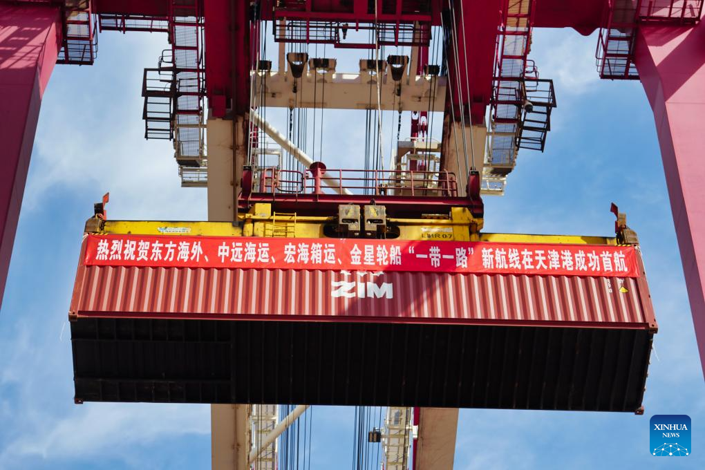 A container is being loaded at the Tianjin Port in north China's Tianjin, Oct. 27, 2020.