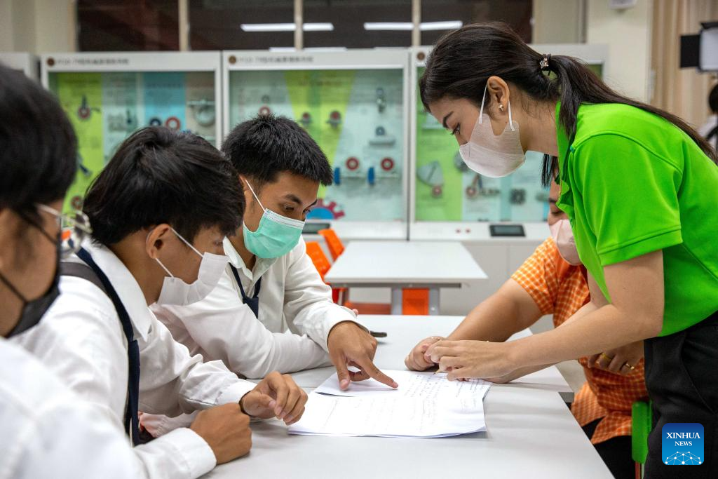 A teacher (1st R) instructs students at the Luban Workshop of Ayutthaya Technical College in Ayutthaya, Thailand, March 14, 2023.