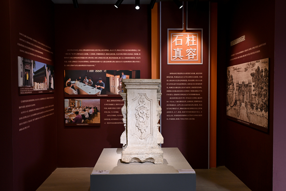 A marble column from Yuanmingyuan, or the Old Summer Palace, is on display at Zhengjue Temple of Yuanmingyuan Ruins Park in Beijing on Friday. An exhibition displaying all seven marble columns repatriated from Norway opened to the public on Friday. [Photo/Xinhua]