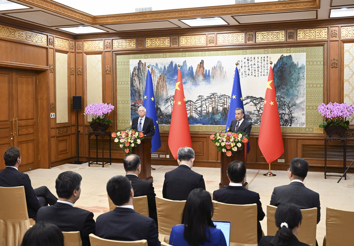 Foreign Minister Wang Yi, also a member of the Political Bureau of the Communist Party of China Central Committee, and Josep Borrell, High Representative of the European Union for Foreign Affairs and Security Policy, hold the 12th round of China-EU High-level Strategic Dialogue in Beijing, capital of China, Oct 13, 2023. [Photo/Xinhua]