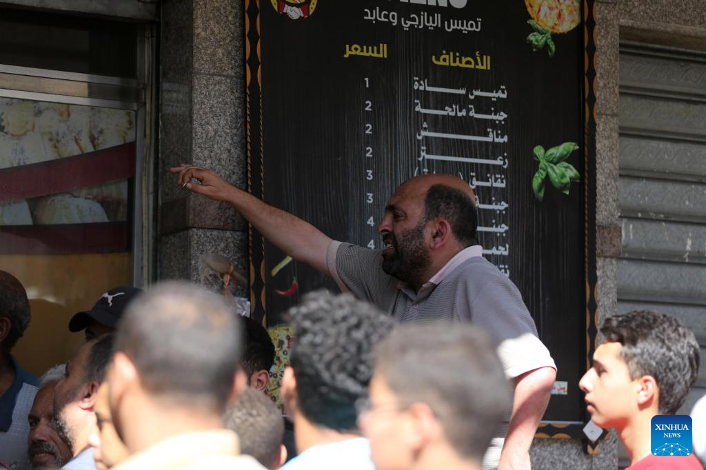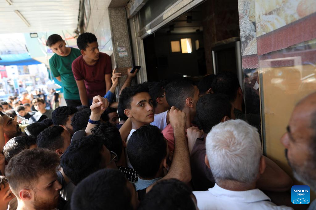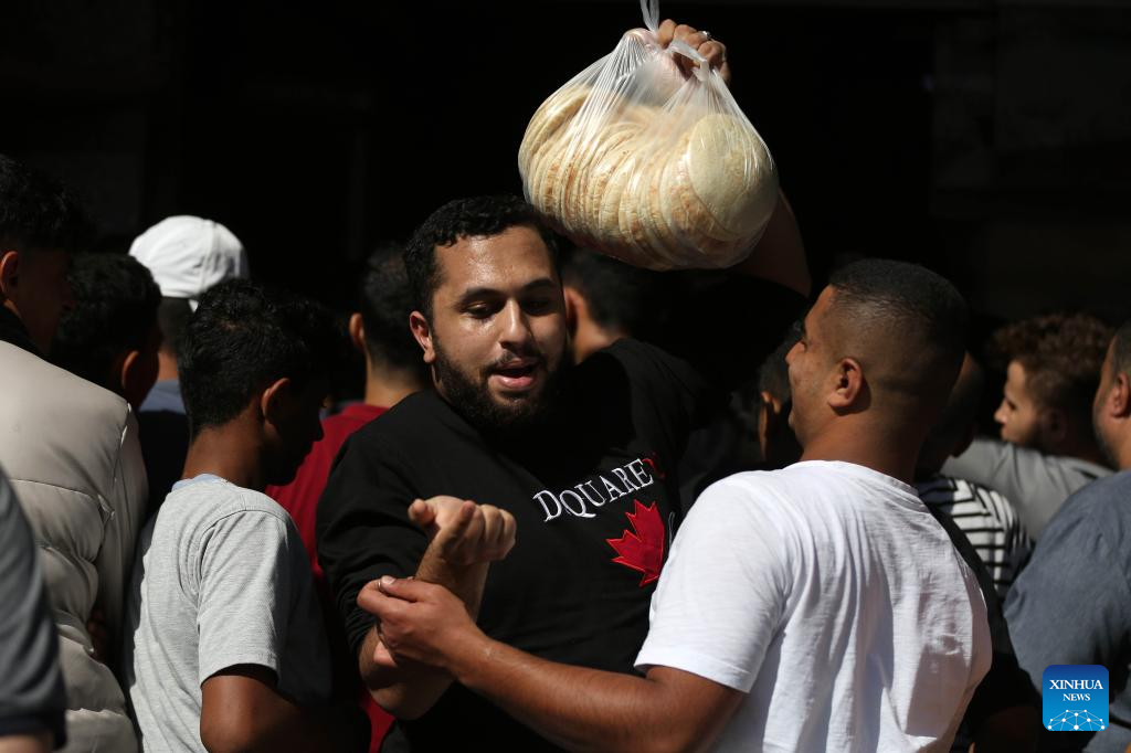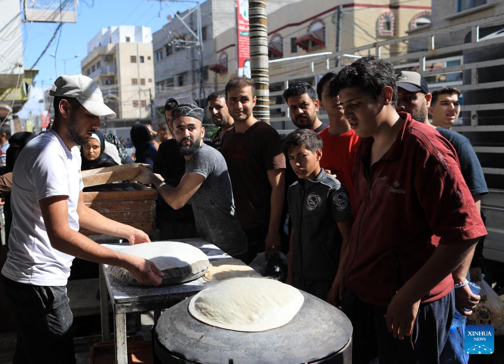 Displaced people gather in front of a bakery to get food in the southern Gaza Strip, Oct. 15, 2023. The United Nations estimated that more than half a million people in the Gaza Strip were displaced from their residences, noting that the UN Agency for Palestine Refugees received about 64 percent of those displaced in 102 emergency shelters, with difficulties providing essential services. (Photo by Yasser Qudih/Xinhua)