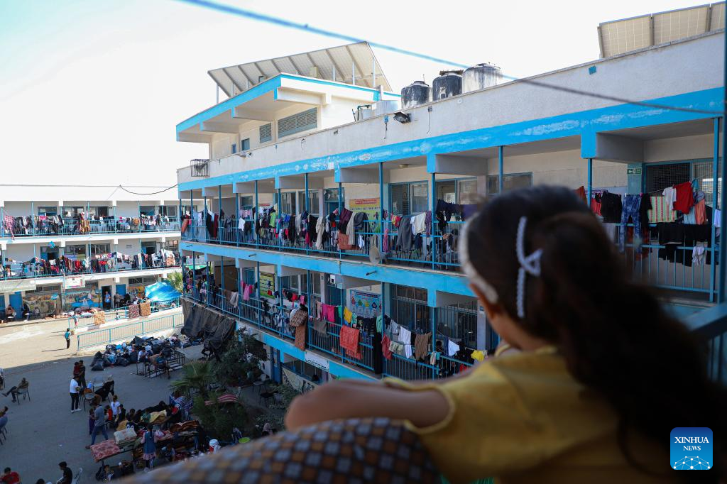 Displaced Palestinians temporarily live in a school in the southern Gaza Strip city of Khan Younis, Oct. 15, 2023. The United Nations estimated that more than half a million people in the Gaza Strip were displaced from their residences, noting that the UN Agency for Palestine Refugees received about 64 percent of those displaced in 102 emergency shelters, with difficulties providing essential services. (Photo by Rizek Abdeljawad/Xinhua)
