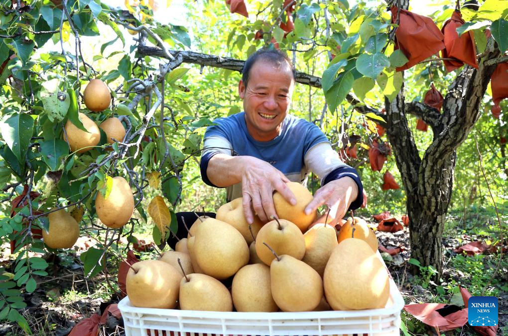 A farmer harvests pears in Ruyang County, central China's Henan Province, Oct. 14, 2023. (Photo by Kang Hongjun/Xinhua)