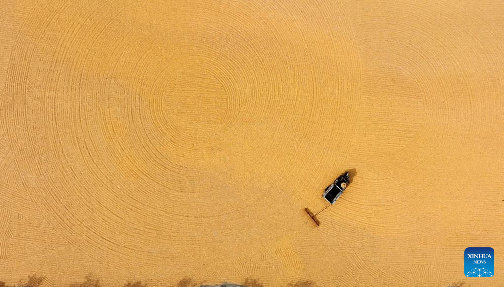 This aerial photo taken on Oct. 12, 2023 shows corn being dried in Tancheng County, east China's Shandong Province. (Photo by Zhang Chunlei/Xinhua)