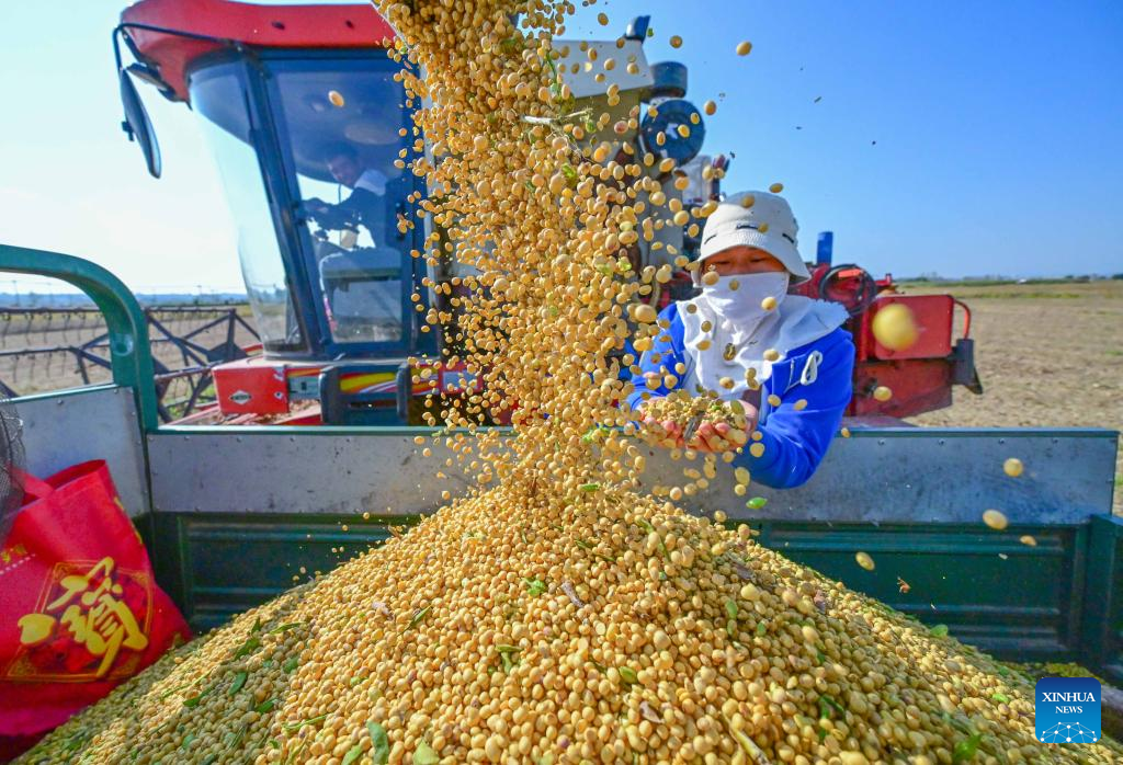 A farmer checks newly-harvested soybeans in Xiagu Village of Luoyang City, central China's Henan Province, Oct. 14, 2023. (Photo by Li Weichao/Xinhua)