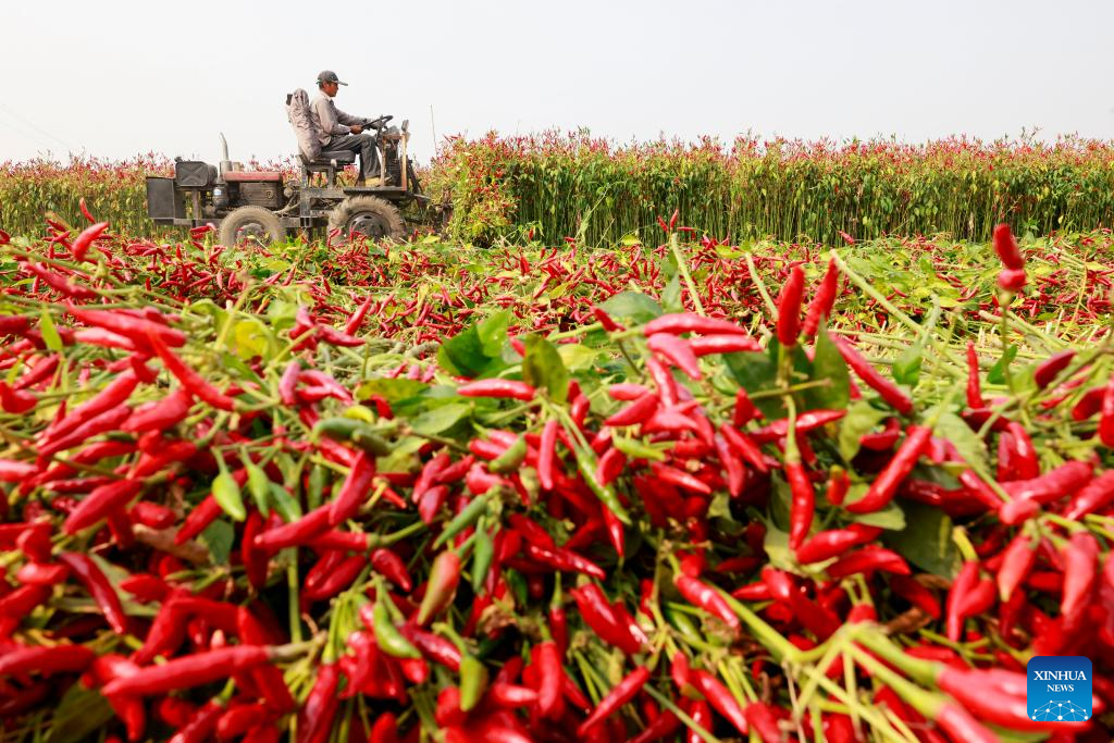 A farmer harvests chili peppers in Fengnan District of Tangshan City, north China's Hebei Province, Oct. 14, 2023. (Photo by Li Xiuqing/Xinhua)