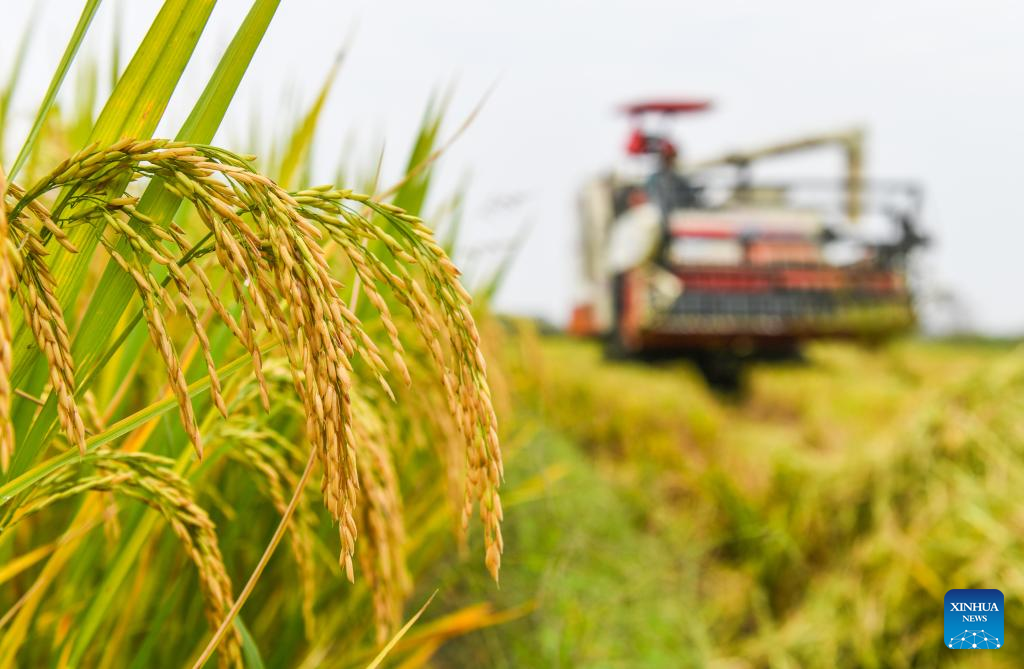 Rice is harvested in Daoxian County, central China's Hunan Province, Oct. 14, 2023. (Photo by Jiang Keqing/Xinhua)
