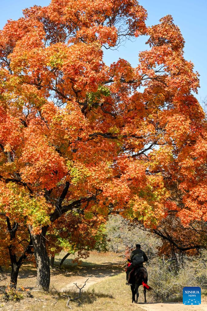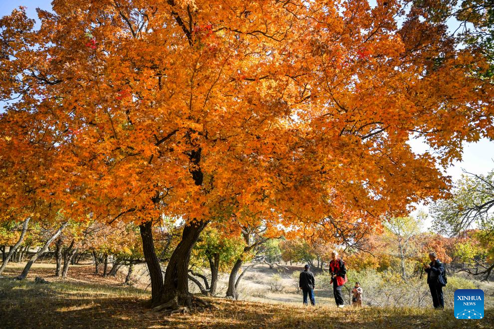 Tourists view maple trees at a forest park in Horqin Left Wing Rear Banner of Tongliao City, north China's Inner Mongolia Autonomous Region, Oct. 14, 2023. (Xinhua/Lian Zhen)