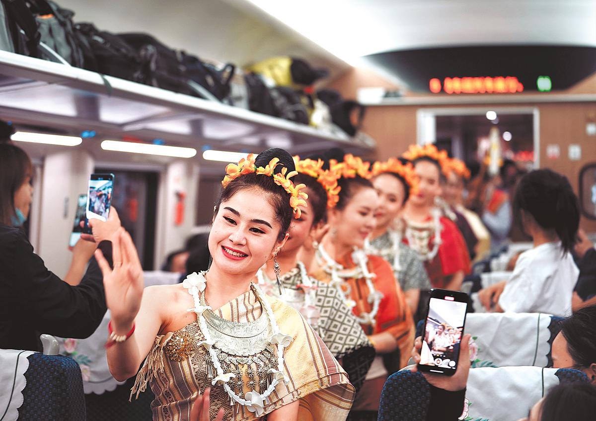 Attendants on a train car of the China-Laos Railway present a performance for passengers in April. [Photo/Xinhua]