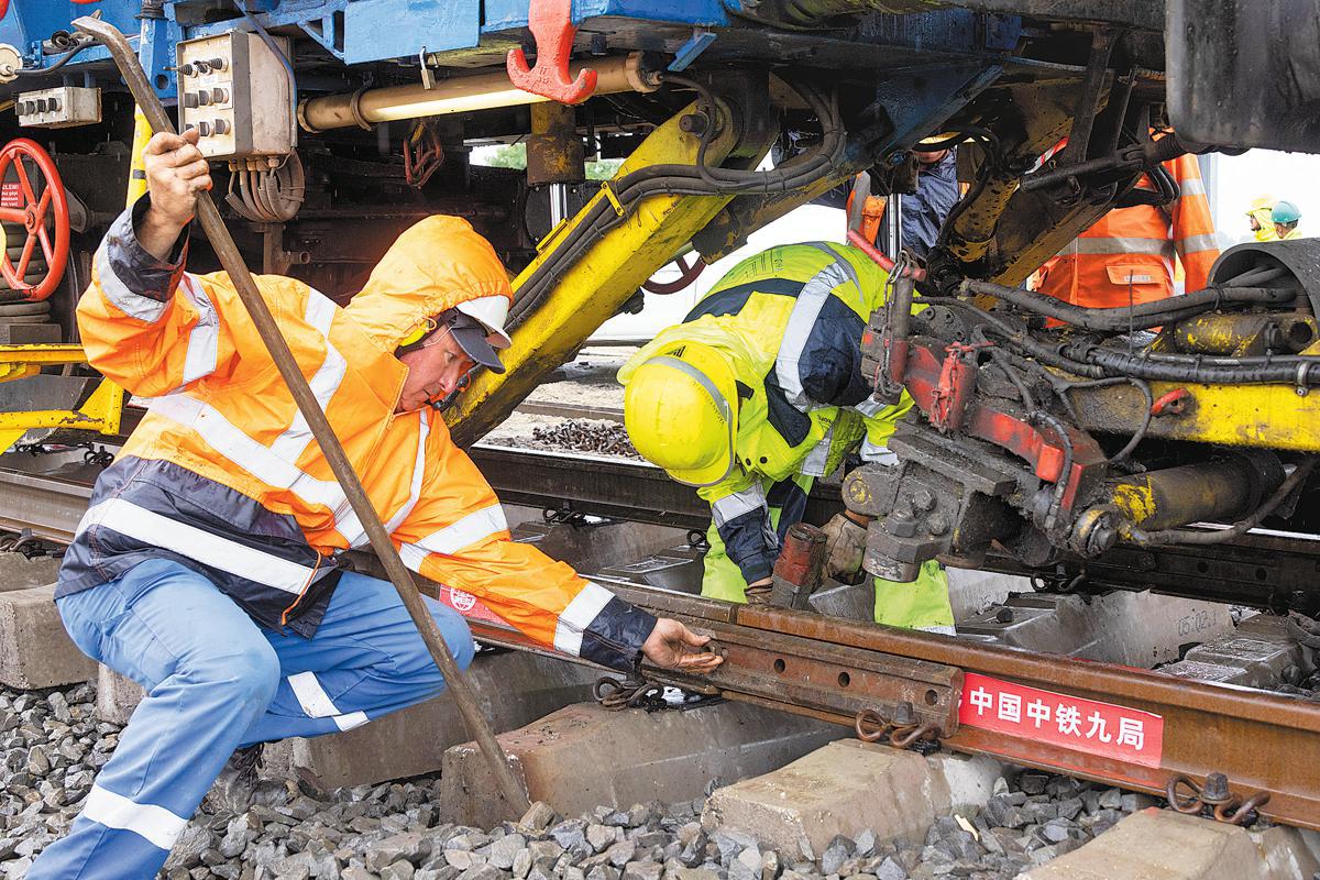 Workers bolster tracks for a section of the Chinese-built Hungary-Serbia Railway in Kunszentmiklos, Hungary, in May. [Photo/Xinhua]
