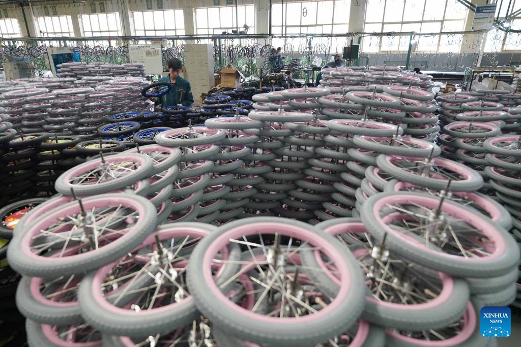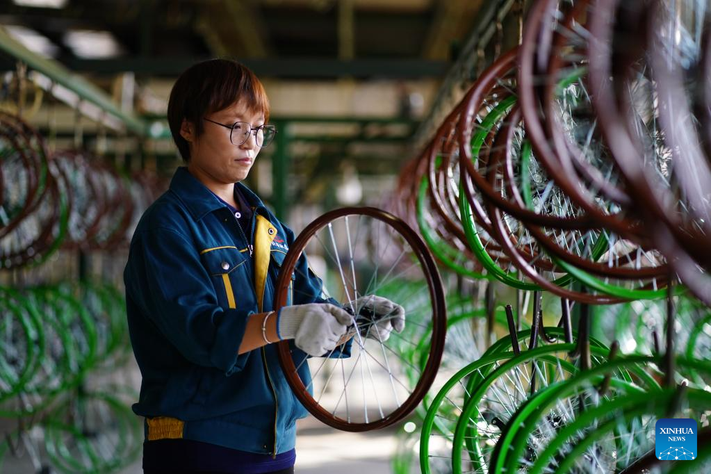 A worker assembles tires for children bicycles at a manufacturing company in Pingxiang County, north China's Hebei Province, Oct. 16, 2023. Pingxiang, dubbed the "city of children wheels," has made great efforts in boosting its children bicycle business in recent years. Products here have been sold to over 60 countries and regions including Russia, Vietnam, Kenya and Sri Lanka. The value of children bicycles directly exported by manufacturers in the county has amounted to 364 million yuan (about 49.76 million U.S. dollars) in the first seven months this year. (Xinhua/Mu Yu)