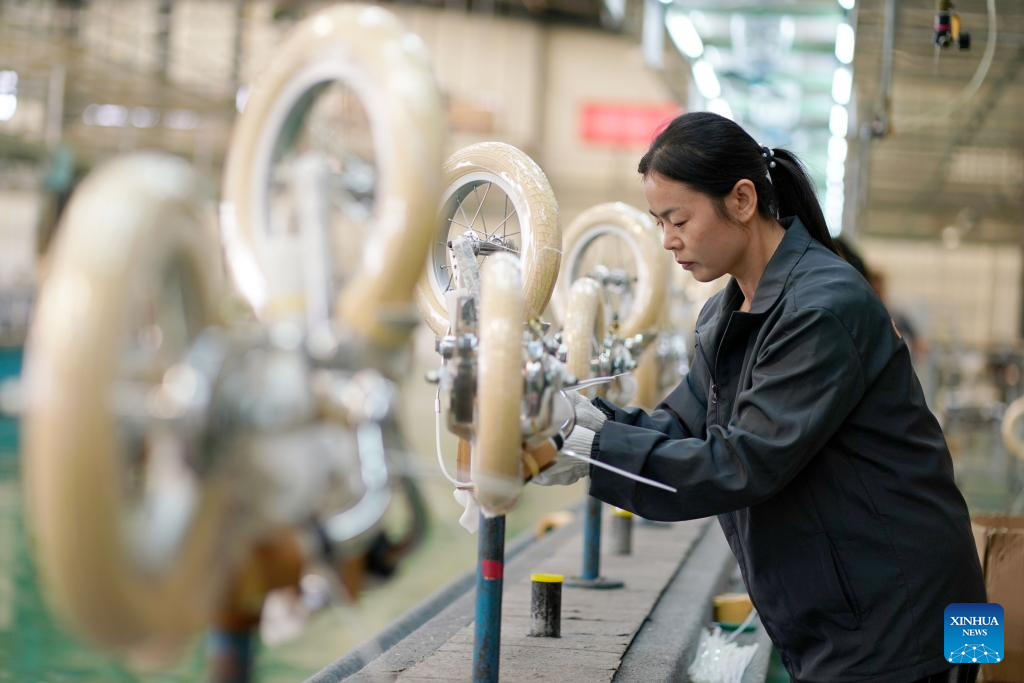 A worker assembles a children bicycle at a manufacturing company in Pingxiang County, north China's Hebei Province, Oct. 16, 2023. Pingxiang, dubbed the "city of children wheels," has made great efforts in boosting its children bicycle business in recent years. Products here have been sold to over 60 countries and regions including Russia, Vietnam, Kenya and Sri Lanka. The value of children bicycles directly exported by manufacturers in the county has amounted to 364 million yuan (about 49.76 million U.S. dollars) in the first seven months this year. (Xinhua/Mu Yu)