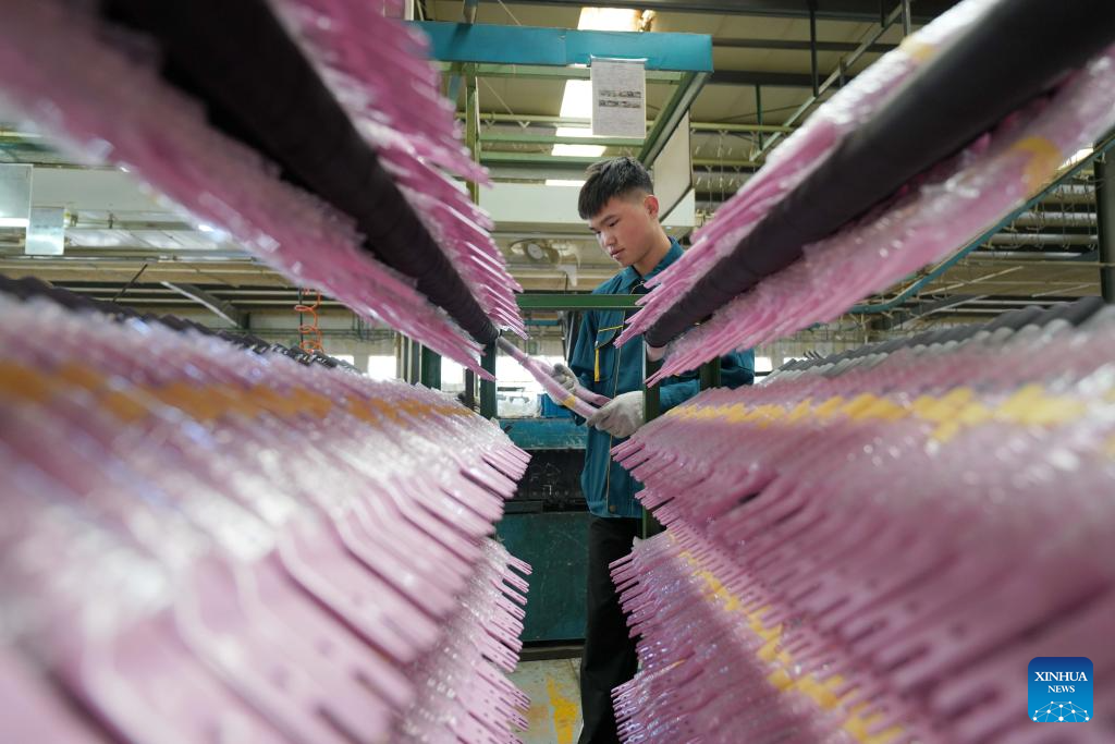 A worker arranges parts of children bicycles at a manufacturing company in Pingxiang County, north China's Hebei Province, Oct. 16, 2023. Pingxiang, dubbed the "city of children wheels," has made great efforts in boosting its children bicycle business in recent years. Products here have been sold to over 60 countries and regions including Russia, Vietnam, Kenya and Sri Lanka. The value of children bicycles directly exported by manufacturers in the county has amounted to 364 million yuan (about 49.76 million U.S. dollars) in the first seven months this year. (Xinhua/Mu Yu)