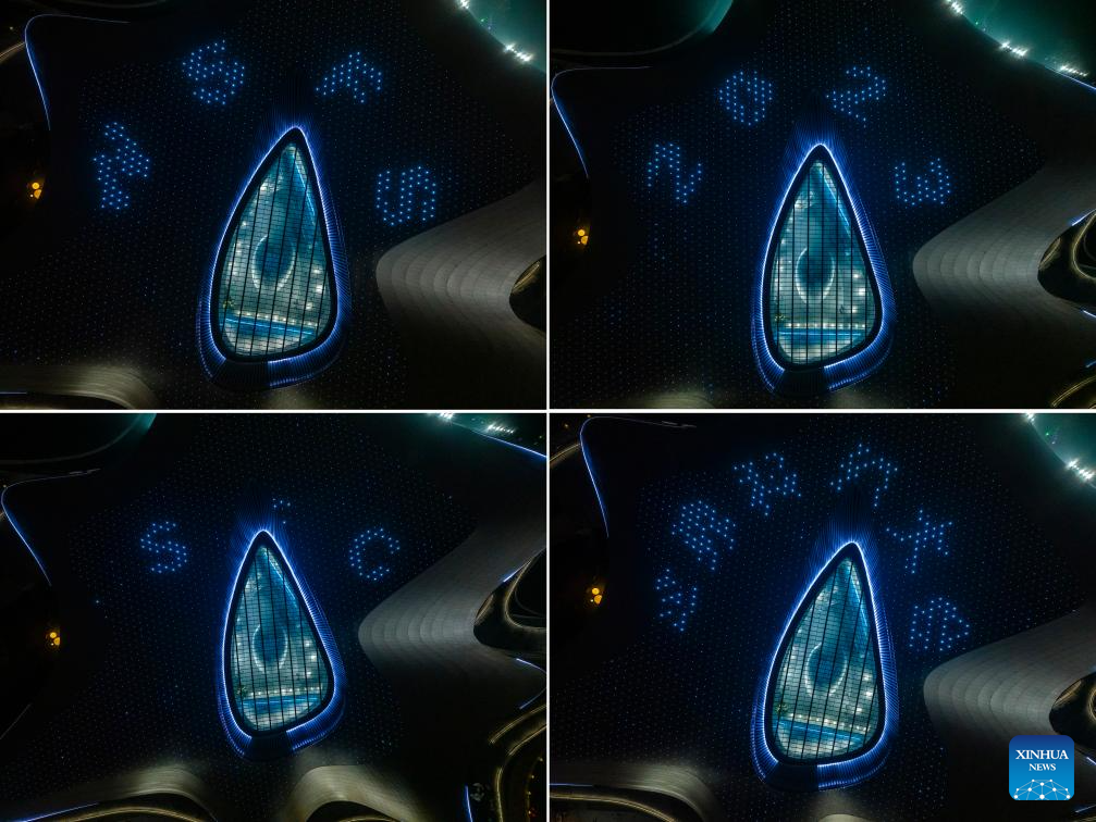 This aerial combo photo taken on Oct. 16, 2023 shows a night view over the roof of the Chengdu Science Museum, main venue for the 81st World Science Fiction Convention (WorldCon), in Chengdu, southwest China's Sichuan Province. The five-day 2023 WorldCon will be opened in Chengdu on Wednesday. (Xinhua/Shen Bohan)