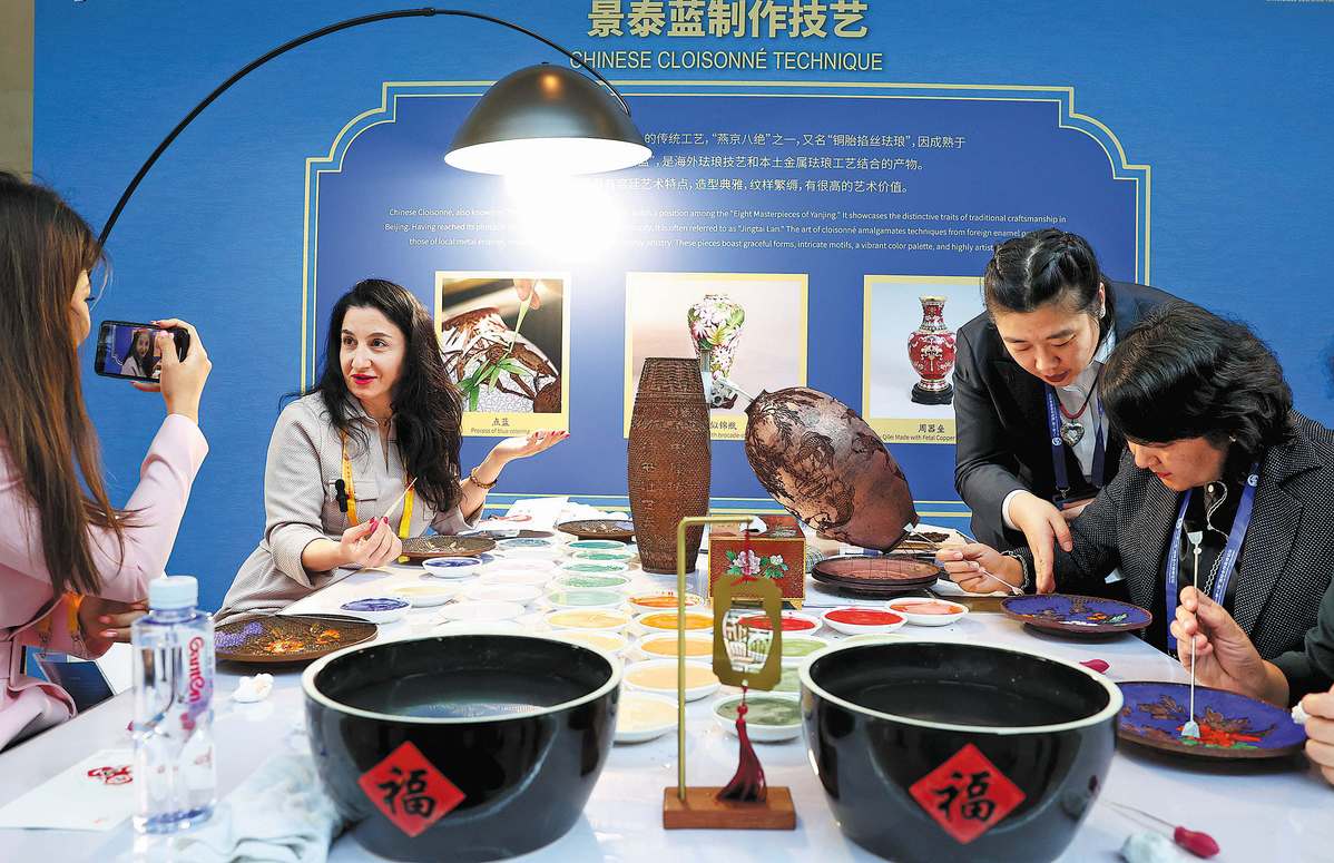 Journalists learn about Chinese cloisonne, a technique used to decorate metalware by soldering metal strips and filling them with enamel paste, at the media center of the third Belt and Road Forum for International Cooperation in Beijing on Monday. FENG YONGBIN/CHINA DAILY