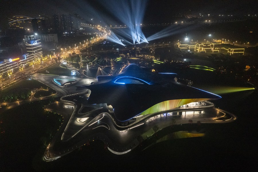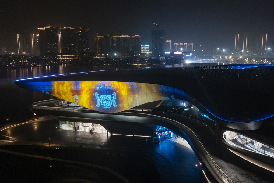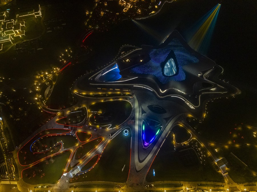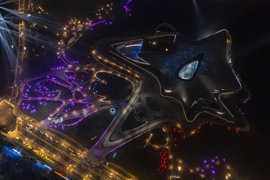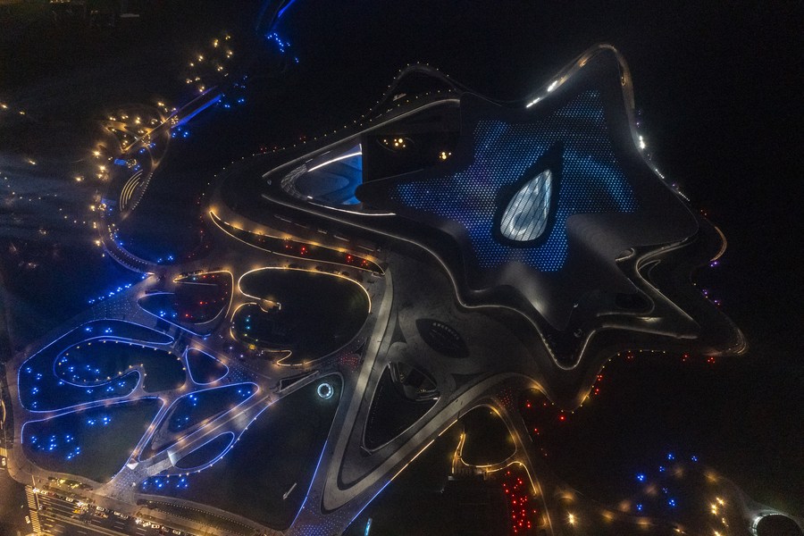 This aerial photo taken on Oct. 16, 2023 shows a night view of the Chengdu Science Museum, main venue for the 81st World Science Fiction Convention (WorldCon), in Chengdu, southwest China's Sichuan Province. (Xinhua/Shen Bohan)