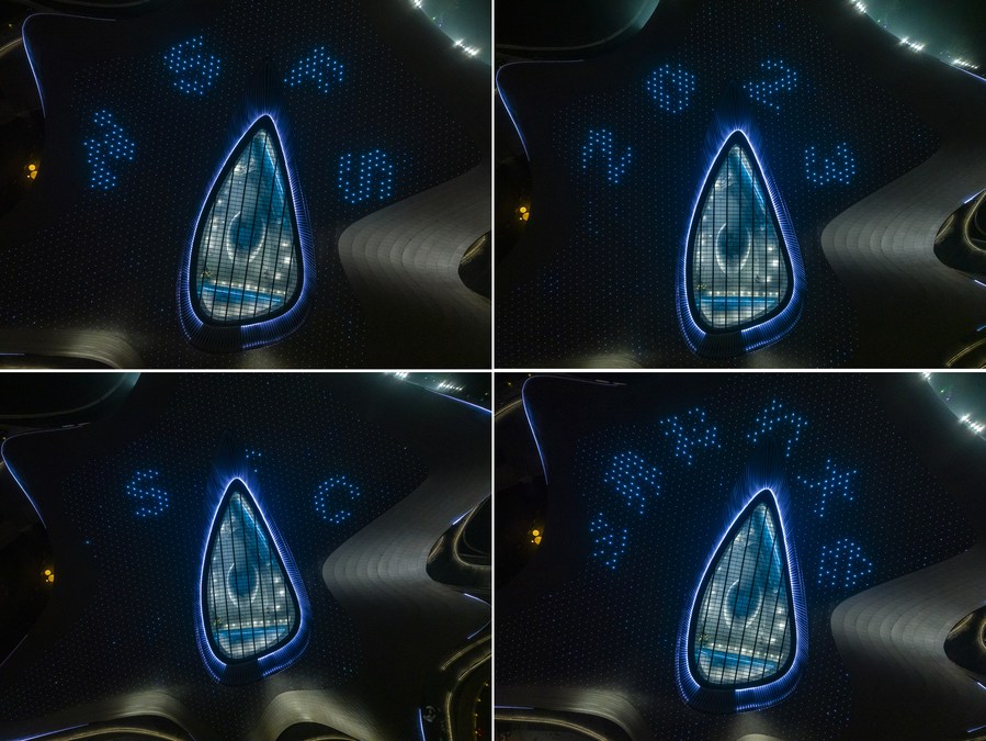 This aerial combo photo taken on Oct. 16, 2023 shows a night view over the roof of the Chengdu Science Museum, main venue for the 81st World Science Fiction Convention (WorldCon), in Chengdu, southwest China's Sichuan Province. (Xinhua/Shen Bohan)