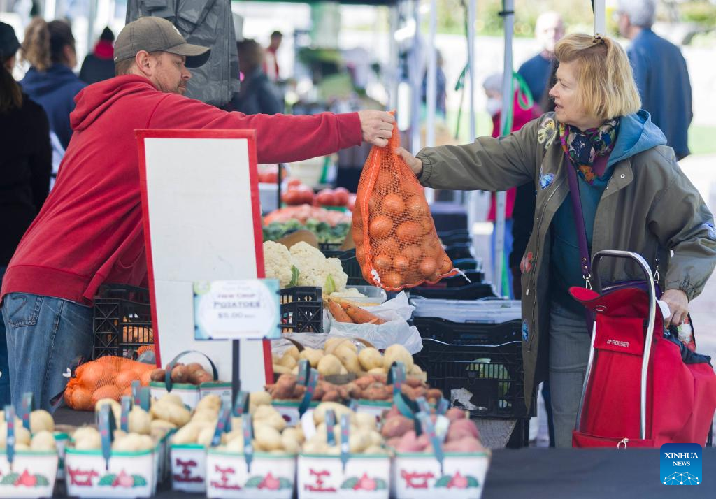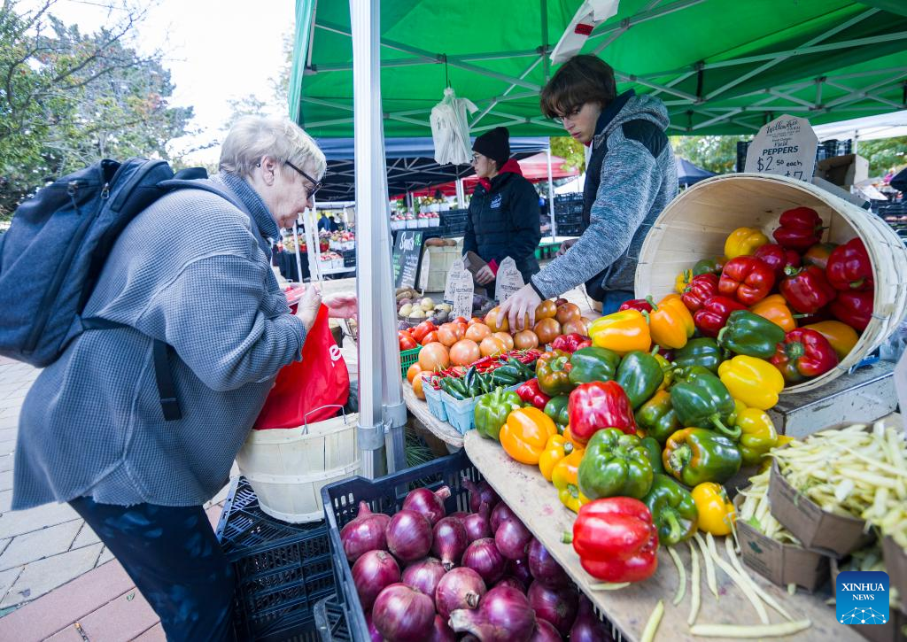 A woman shops at a farmers' market in Toronto, Canada, on Oct. 17, 2023. Canada's consumer price index (CPI) rose 3.8 percent in September on a year-over-year basis, down from a 4 percent gain in August, Statistics Canada said Tuesday. (Photo by Zou Zheng/Xinhua)