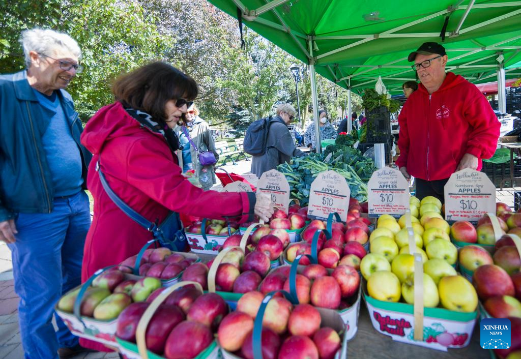 People shop at a farmers' market in Toronto, Canada, on Oct. 17, 2023. Canada's consumer price index (CPI) rose 3.8 percent in September on a year-over-year basis, down from a 4 percent gain in August, Statistics Canada said Tuesday. (Photo by Zou Zheng/Xinhua)
