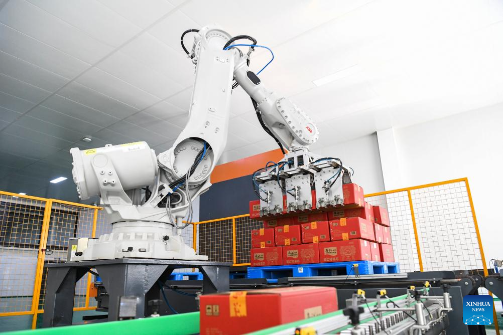 This photo taken on Oct. 16, 2023 shows a robotic arm processing Zhacai (pickled mustard tubers) products at an intelligent production workshop of Chongqing Fuling Zhacai Group Co., Ltd. in southwest China's Chongqing Municipality. The history of pickle-making in Chongqing's Fuling, a major pickle production base, dates back more than 150 years. The district's traditional method of producing preserved mustard tubers was listed as a state-level intangible cultural heritage in 2008.