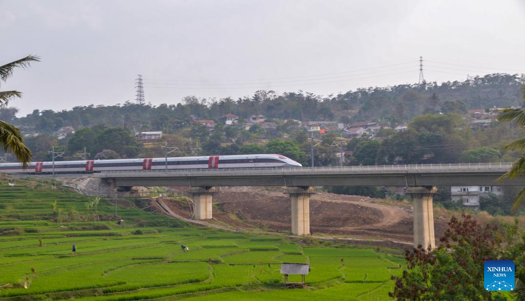 This photo taken on Oct. 16, 2023 shows a high-speed electrical multiple unit (EMU) train running on the Jakarta-Bandung High-Speed Railway in Padalarang, Indonesia. The Jakarta-Bandung High-Speed Railway (HSR) jointly built by China and Indonesia was officially put into commercial operation on Tuesday.