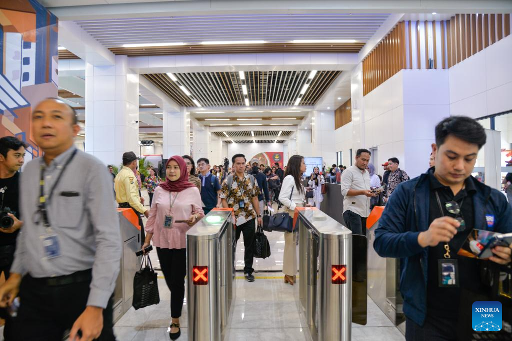People check in by swiping their tickets at the platform of Halim Station on the Jakarta-Bandung High-Speed Railway in Jakarta, Indonesia, Oct. 17, 2023. The Jakarta-Bandung High-Speed Railway (HSR) jointly built by China and Indonesia was officially put into commercial operation on Tuesday.