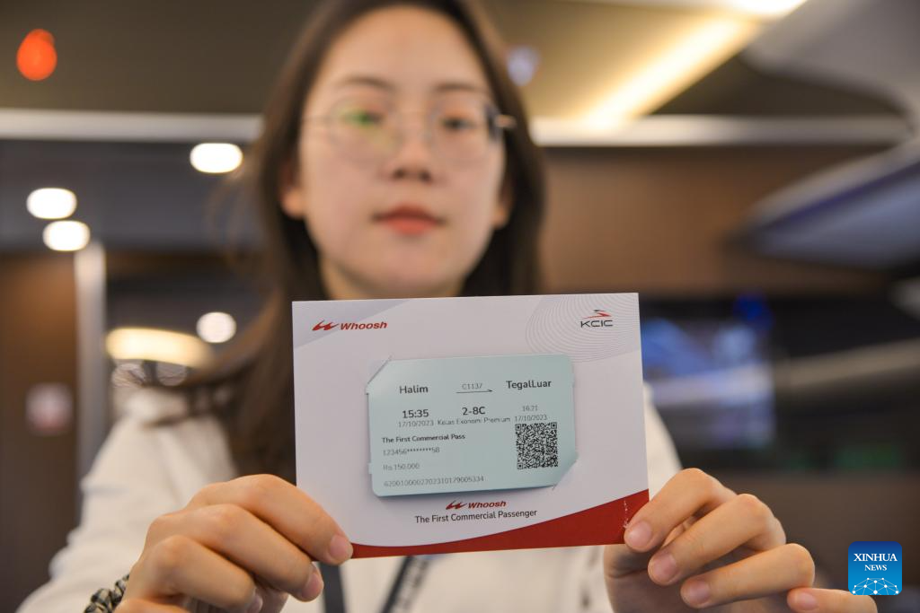 A passenger shows a commemorative ticket in a carriage of a high-speed electrical multiple unit (EMU) train running on the Jakarta-Bandung High-Speed Railway in Indonesia, Oct. 17, 2023. The Jakarta-Bandung High-Speed Railway (HSR) jointly built by China and Indonesia was officially put into commercial operation on Tuesday.