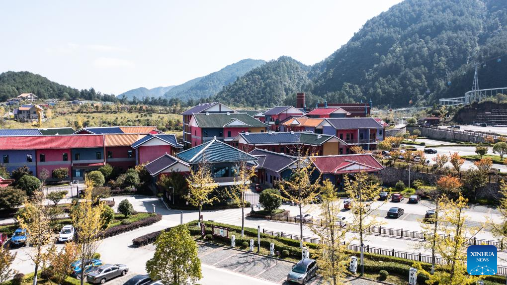 This aerial photo taken on Oct. 17, 2023 shows new energy vehicles charging at a charging area (bottom, R) in Longshan Township, Longli County of Qiannan Bouyei and Miao Autonomous Prefecture, southwest China's Guizhou Province. In recent years, the Guizhou Power Grid Co., Ltd of China Southern Power Grid has been working diligently to extend the charging network for new energy vehicles to the rural areas. Charging piles are now available in every township in Guizhou thanks to well orchestrated efforts to fully meet the public's demand for eco-friendly transportation in the past few years. (Xinhua/Tao Liang)