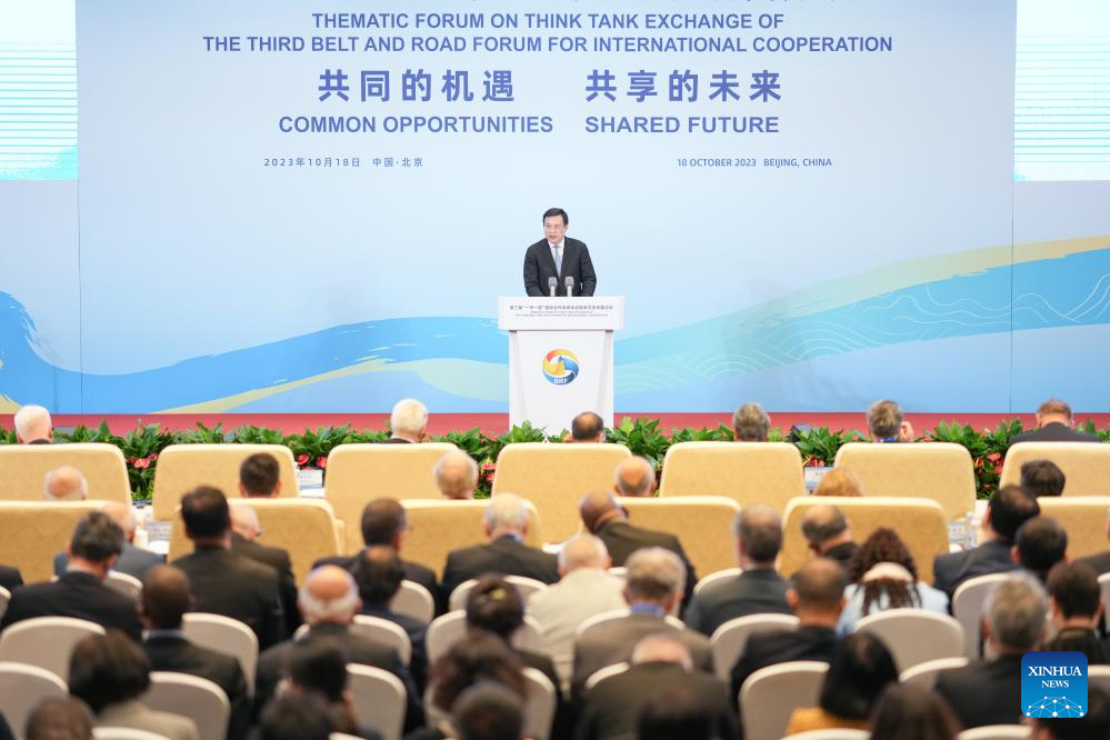 Fu Hua, president of Xinhua News Agency, speaks at the Thematic Forum on Think Tank Exchange of the third Belt and Road Forum for International Cooperation (BRF), in Beijing, capital of China, Oct. 18, 2023. (Xinhua/Peng Ziyang)